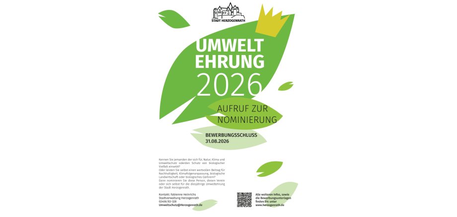 Die Stadt Herzogenrath sucht wieder Menschen, sich besonders für Natur-, Umwelt- oder Klimaschutz einsetzen sowie um den Schutz der biologischen Vielfalt verdient machen. Diese ehrenamtlich tätigen Einzelpersonen, Vereine, Gruppen oder Organisationen können ab sofort für die Herzogenrather Umweltehrung 2026 nominiert werden.